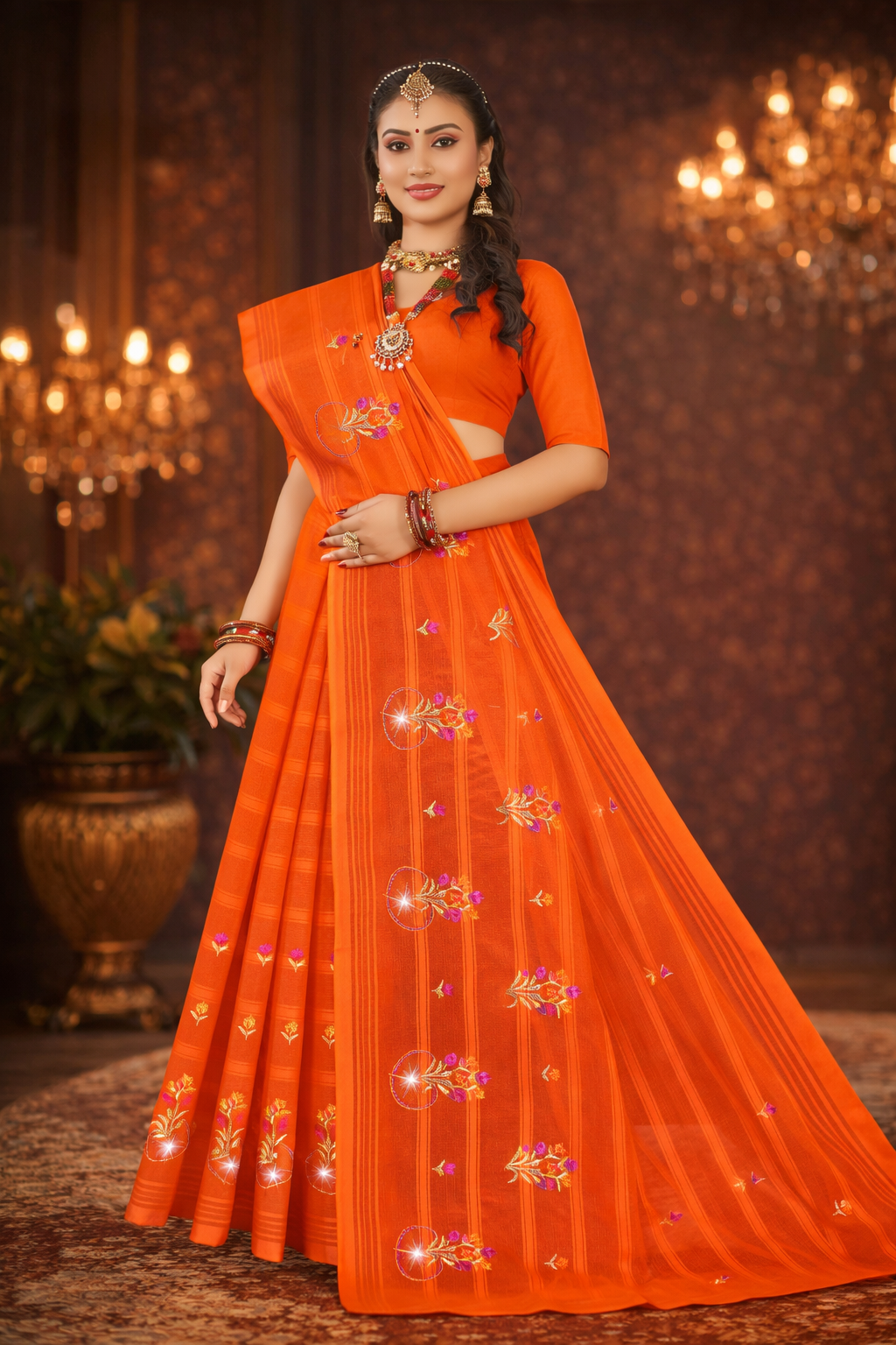 Crafted from premium quality fabric, it offers a soft texture, lightweight feel, and comfortable drape for all-day wear. The detailed embroidery enhances the richness of the saree, making it ideal for festive occasions, family functions, office events, and casual gatherings.